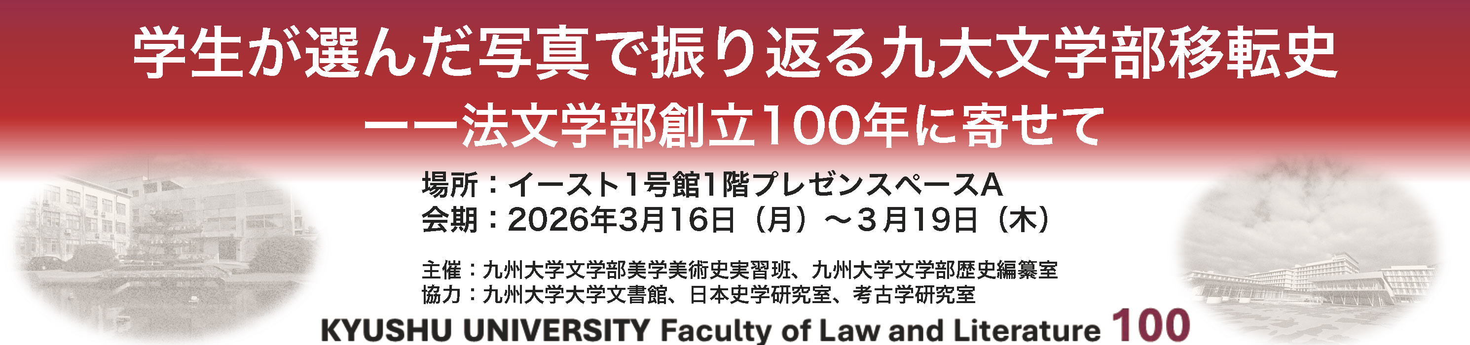 2024年に法文学部は創立100周年を迎えました。これまで文学部歴史編纂室では、1940年代、1960年代、1980年代を特集した展示企画を行って参りましたが、飯嶋秀治・前歴史編纂室長からのご提案により、法文学部記念事業の一環として美学・美術史研究室の実習と共催で展示企画を立ち上げることになりました。2025年前期から機材の使用方法などを体験したのち、主に2025年の後期に企画会議を重ねた結果、2018年に行われたキャンパス移転をテーマにすることに決まりました。学生にとって身近な伊都キャンパスへ、既に美しき過去の記憶になりつつある箱崎キャンパスからの移転は、これまでの10年単位の特集を超えて法文学部全体の歴史へと広がる一方、企画の射程が広がることで寧ろ相応しい写真の選定に困難を抱えることにもなりました。 ここに九州大学大学文書館、日本史学研究室、考古学研究室のご協力と写真の提供を受けて、全5章・51葉の写真を中心に「学生が選んだ写真で振り返る九大文学部移転史--法文学部創立100年に寄せて」の展示を行います。九州大学文学部が歩んだ過去と現在を結び、これから伊都キャンパスで開かれるであろう未来をこの展示から感じて頂ければ幸いです。
